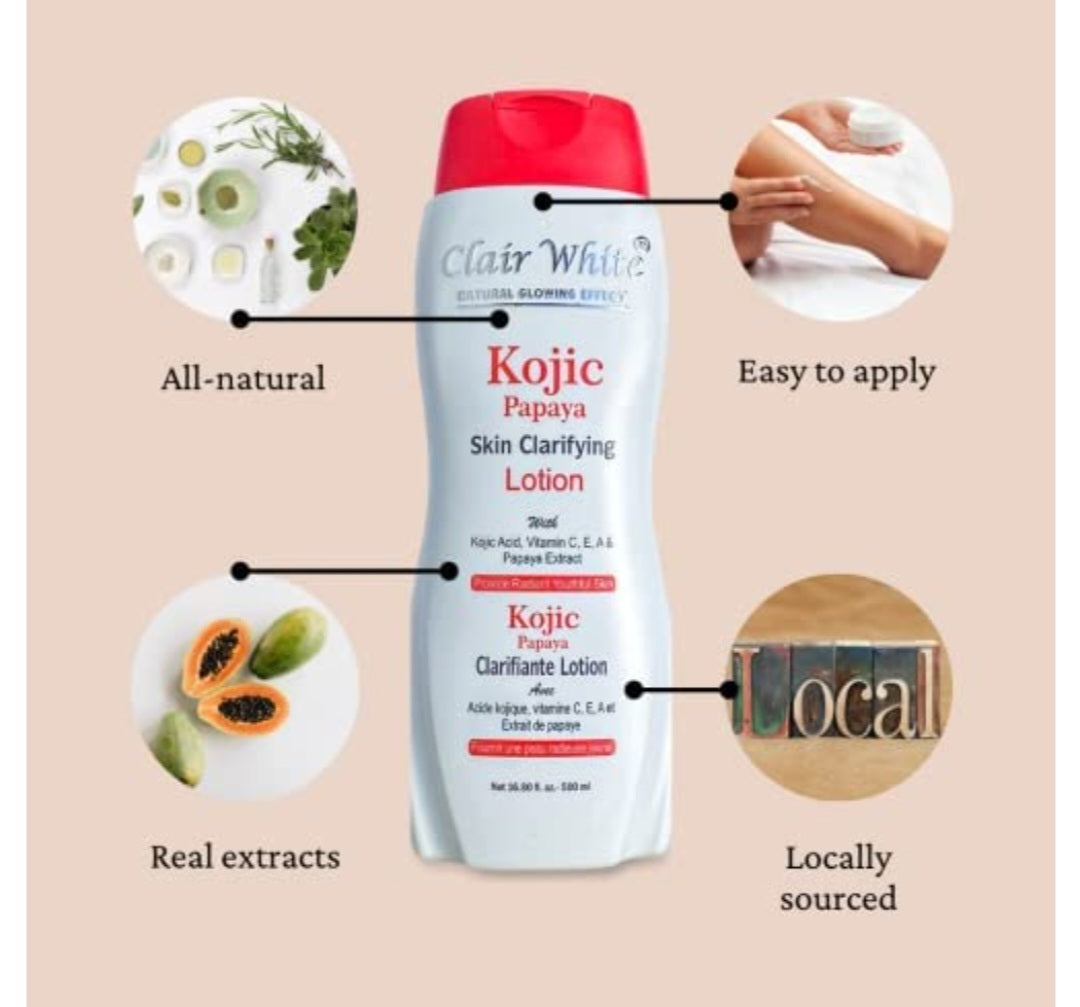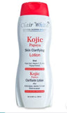 Experience the magic of clearer and brighter skin with Clair White Kojic Papaya Skin Clarifying Lotion. This generous 500ml bottle, packed with the goodness of Kojic Acid and Papaya extract, is designed to promote a more even and radiant complexion. Key Features: Kojic Acid Power: Enriched with Kojic Acid, known for its skin-lightening properties, this lotion helps reduce the appearance of dark spots, blemishes, and uneven skin tone. Papaya Extract: Papaya extract, rich in natural enzymes, exfoliates and clarifies the skin, promoting a smoother and more youthful appearance. Deep Hydration: Clair White Kojic Papaya Skin Clarifying Lotion delivers deep and lasting hydration, leaving your skin feeling soft, smooth, and beautifully moisturized. Quick Absorption: The non-greasy, fast-absorbing formula ensures easy application, allowing you to go about your daily activities without any discomfort. Versatile Usage: Whether you use it as a daily moisturizer or as part of your skincare routine, this lotion is versatile and suitable for various skin needs. Elevate your skincare routine and experience the transformative power of Clair White Kojic Papaya Skin Clarifying Lotion. Achieve a clearer and more radiant complexion with every application. Unveil your skin's natural beauty and elevate your skincare game with this exceptional lotion – because your skin deserves to glow with confidence and clarity.